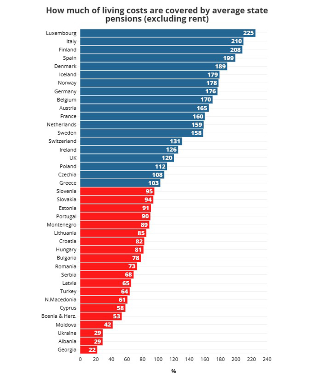 სახელმწიფო პენსიები საკმარისია მარტოხელა ადამიანის ცხოვრების ხარჯების დასაფარად შვეიცარიაში (131%), ირლანდიაში (126%), დიდ ბრიტანეთში (120%), პოლონეთში (112%), ჩეხეთსა (108%) და საბერძნეთში (103%).